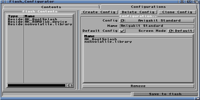Apart from additional RAM, this card has the special feature of 4MB writeable Flash memory. Software such as ROMs and modules written to this Flash memory will be retained even when the computer is powered down. Software contained inside the Flash memory will be instantly available on power on. Kickstart modules or even full Kickstart images can be written to the Flash memory area using our configuration utility.