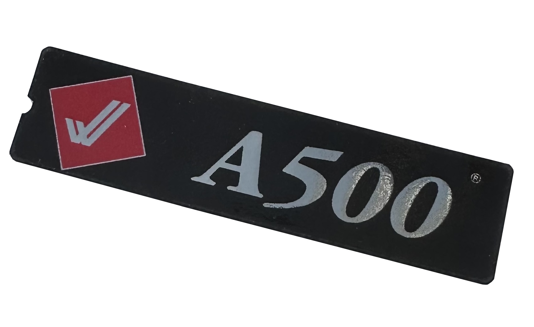 A500 logo has silver metallic appearance. Double check/tick is also silver in colour on a red metallic diamond.