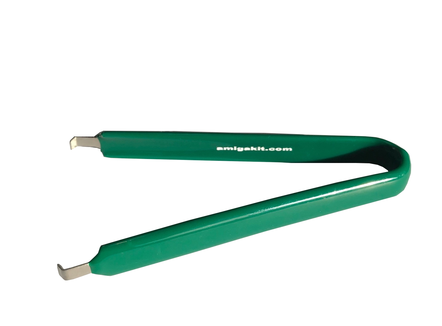 A pair of insulated sprung steel tweezers with hooked ends for removing and placing ICs without making contact with the pins.