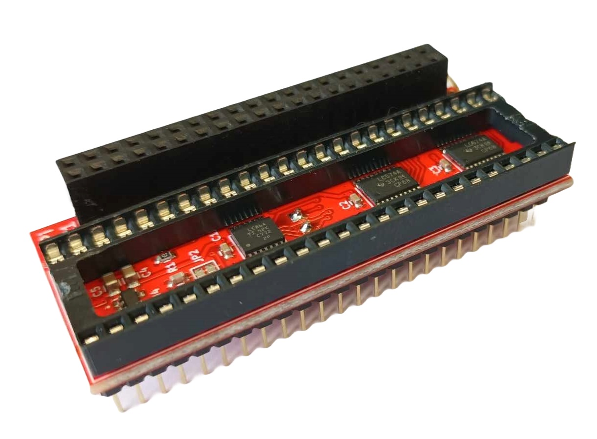 This adapter is plugged into the Denise socket on the Amiga 500 motherboard and in turn the Denise chip is piggybacked into the