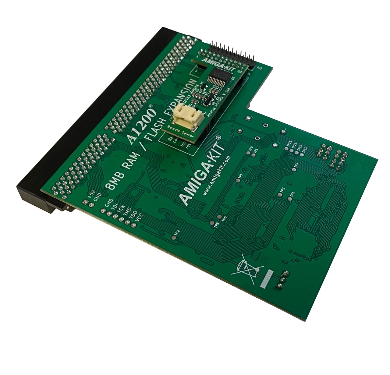 The pictured A1200 Flash and A600 expansions products are not included and shown to illustrate how the Real Time Clock and Sensor Module is installed. A1200 is a trade mark of AmigaKit Ltd