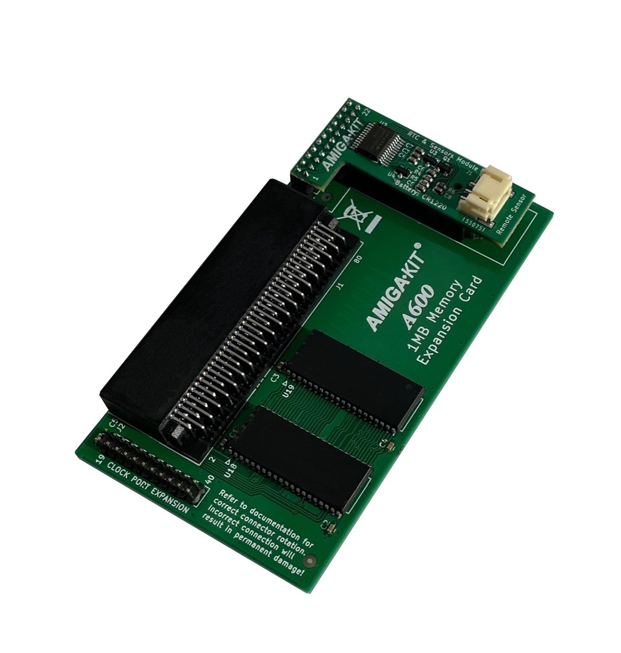 The pictured A1200 Flash and A600 expansions products are not included and shown to illustrate how the Real Time Clock and Sensor Module is installed. A1200 is a trade mark of AmigaKit Ltd