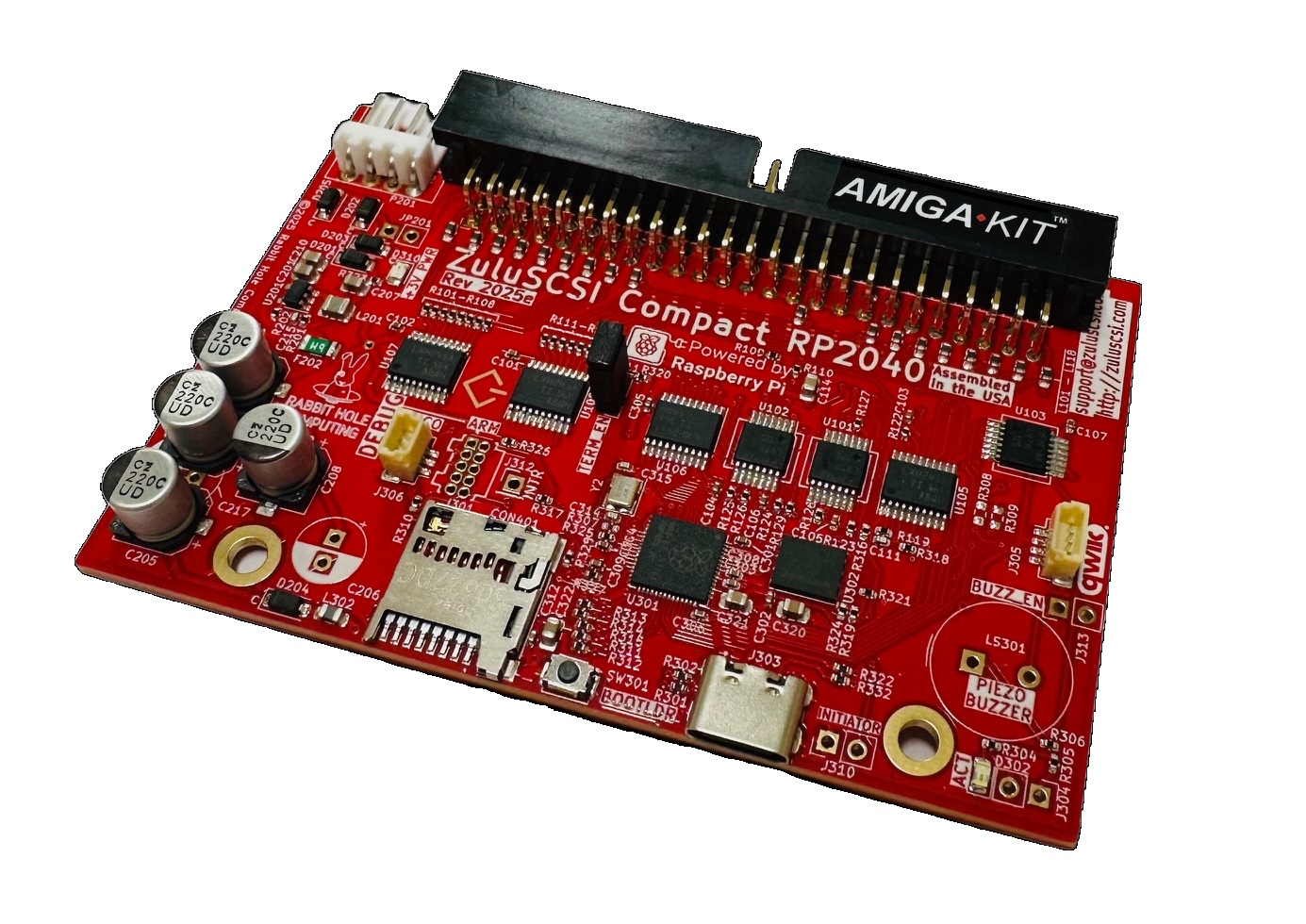 This ZuluSCSI Compact RP2040 uses a microSD card socket, is pre-flashed with firmware, and hand-tested. All surface-mount components are factory-assembled, and the SCSI interface on the board has been tested to ensure full functionality.